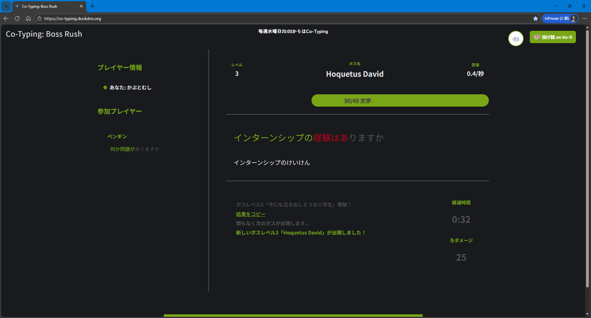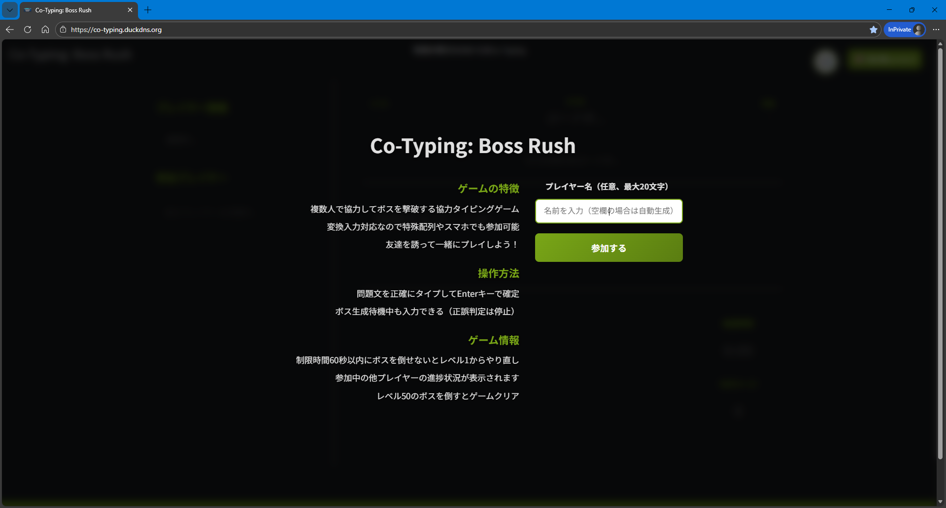 - 複数人で協力してボスを撃破する協力タイピングゲーム